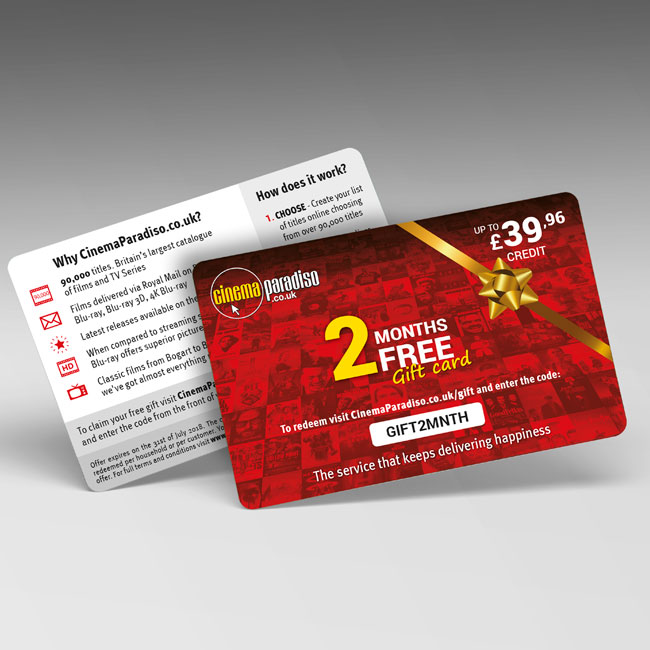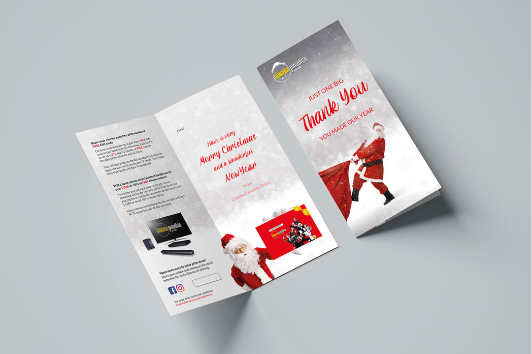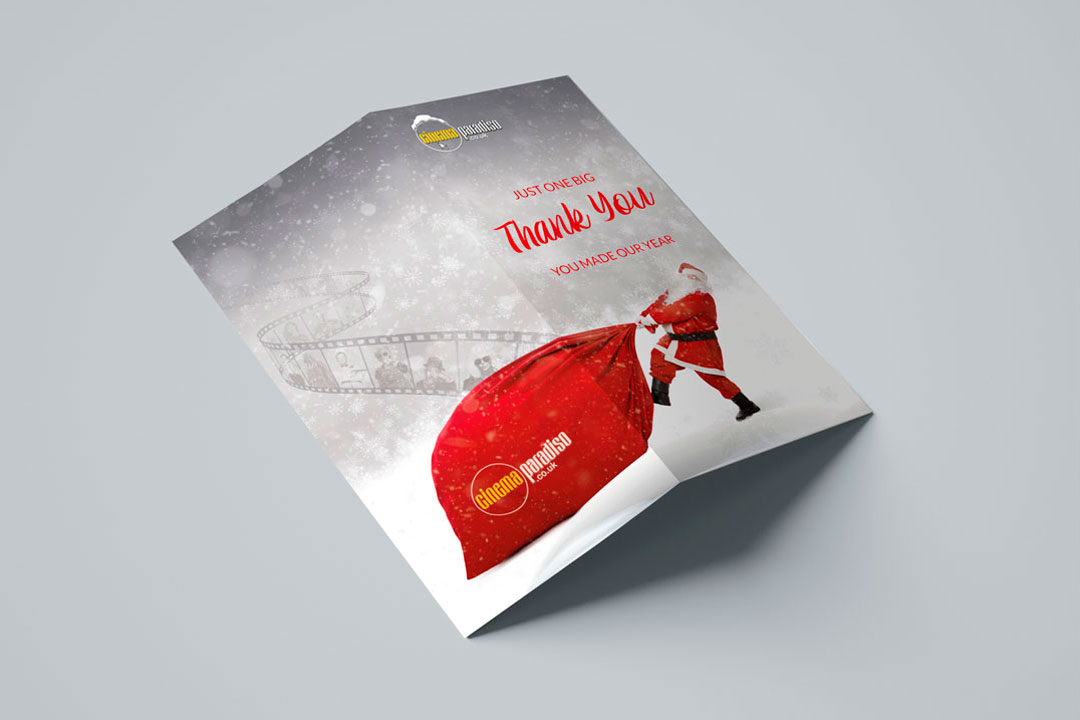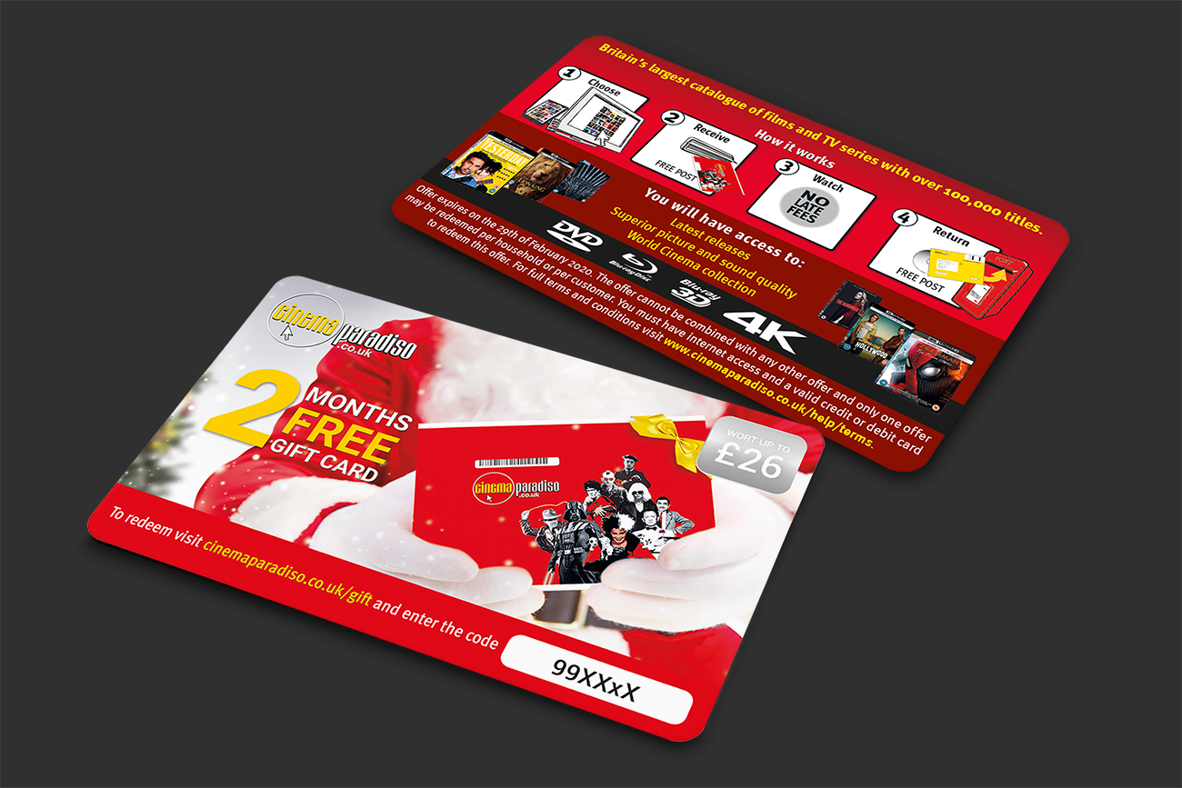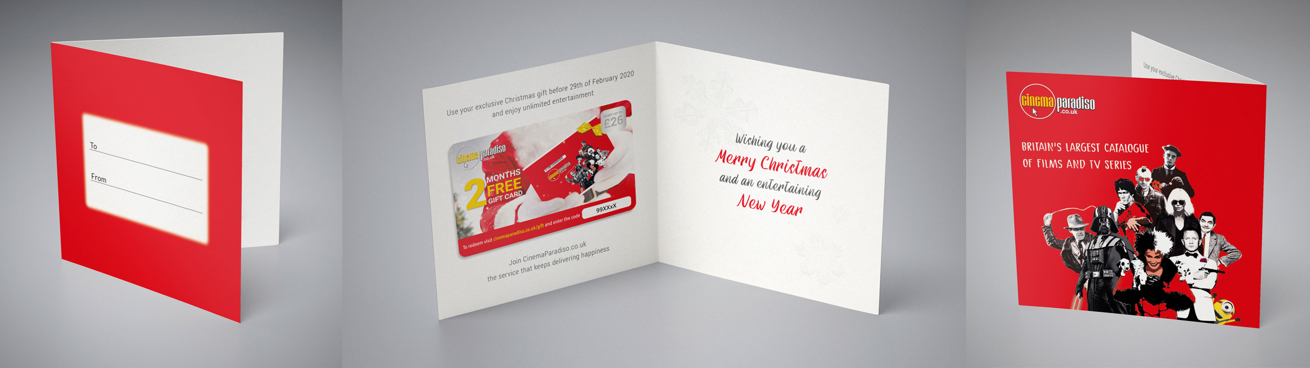 Envelope, greeting card with prize game, and gift card for loyal members of the Cinema Paradiso club. Design and prepress.